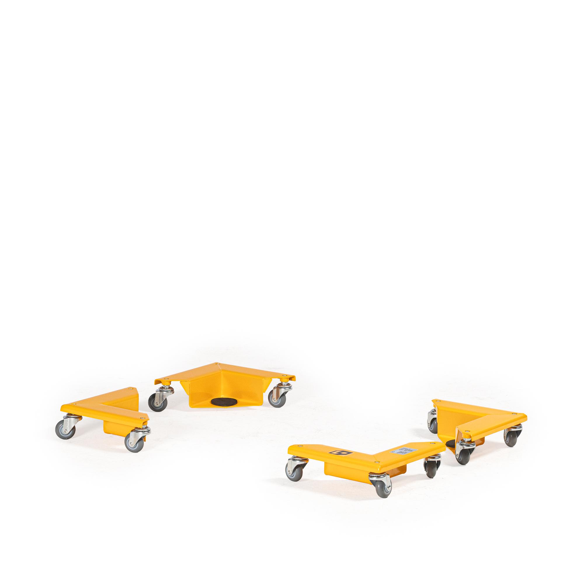 • Les coins roulants, quant à eux, ont une forme angulaire à 90°. Ils s’insèrent sous les coins d’un meuble ou d’une charge pour un déplacement dans toutes les directions. Chaque coin est muni de 3 roulettes pivotantes, offrant une excellente manœuvrabilité.