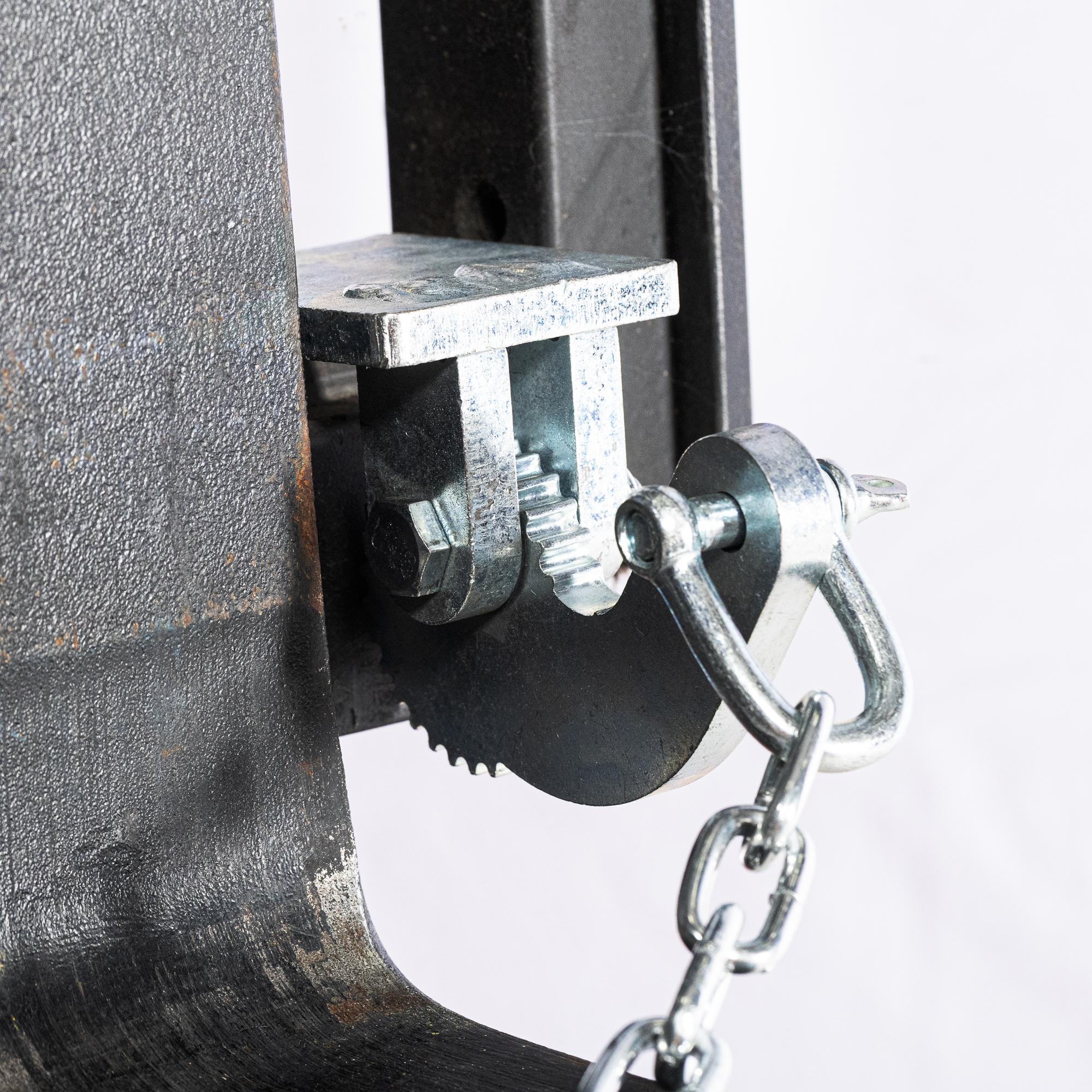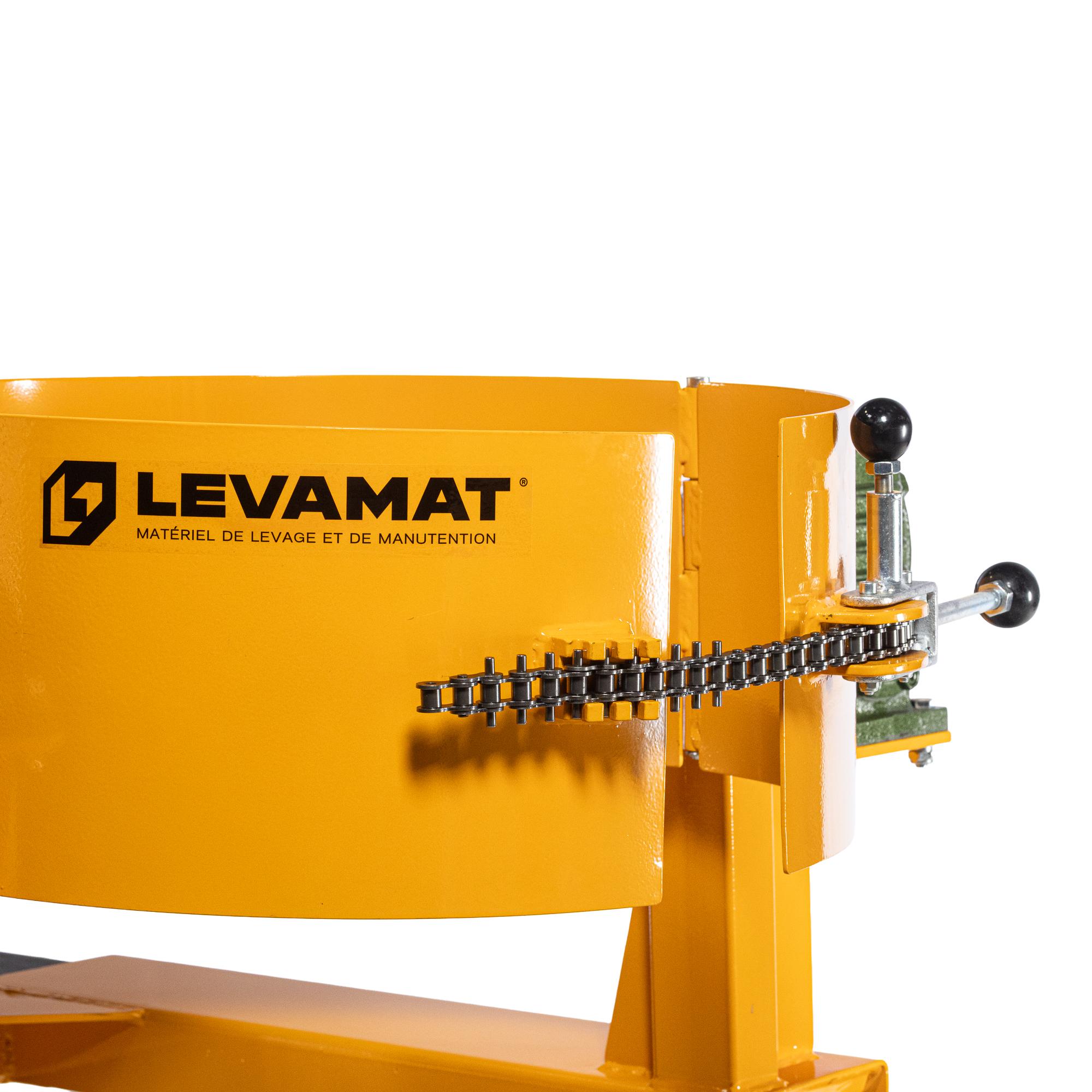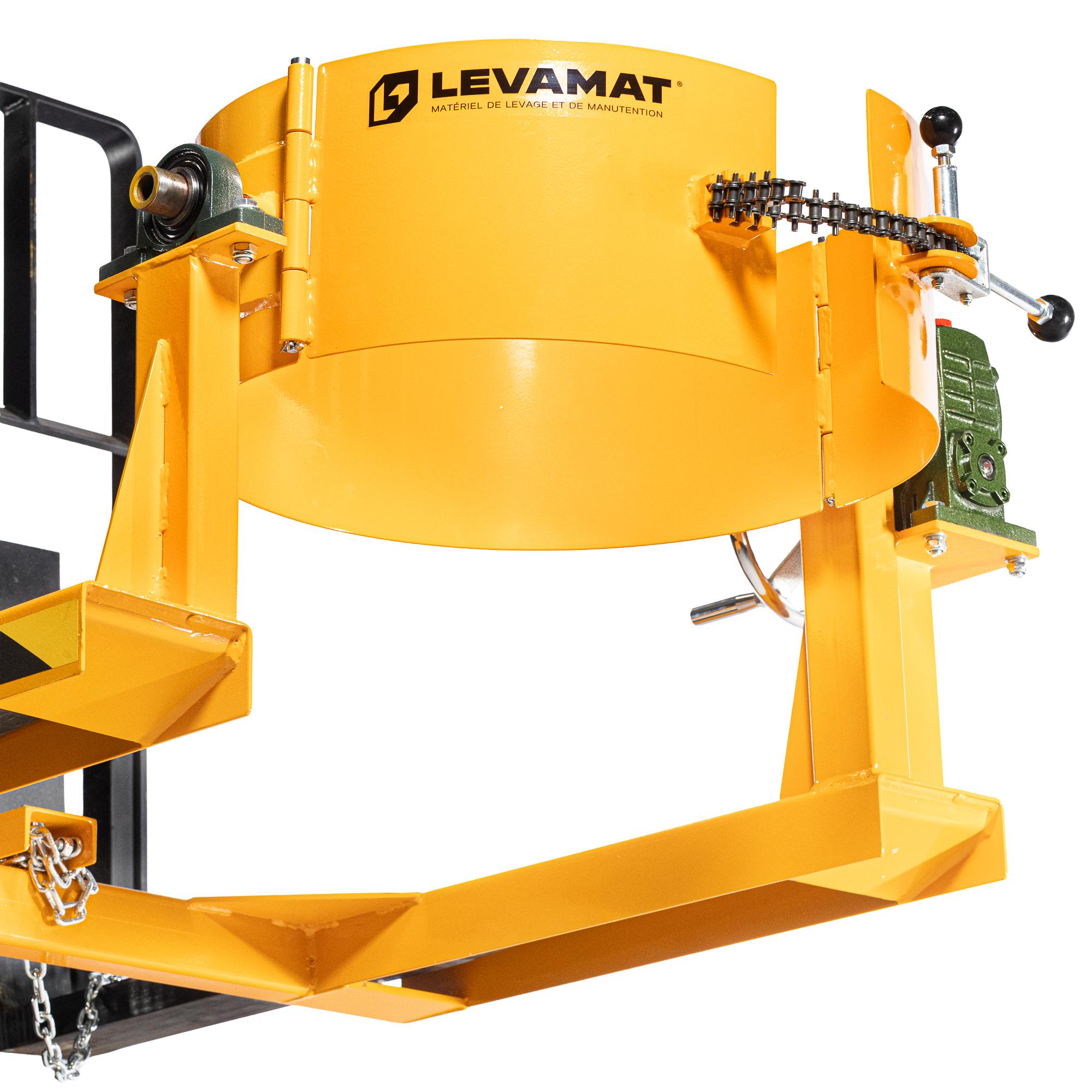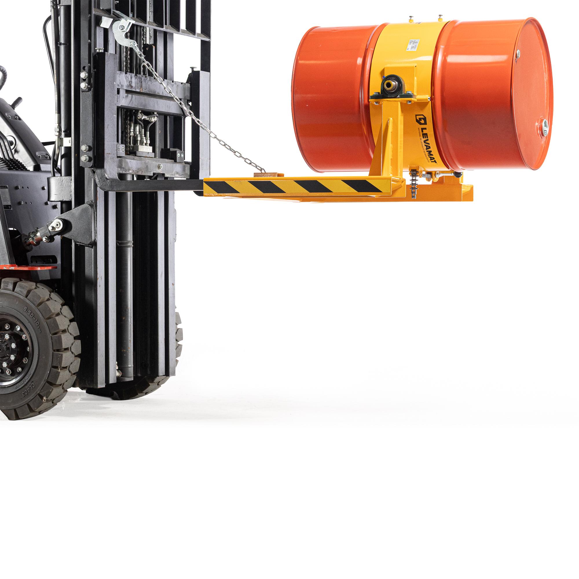 Cet accessoire transforme un chariot élévateur en outil de levage et de vidage de fût, sans recourir à un poste de basculement fixe. Une fois fixé, le fût est maintenu par une ceinture sécurisée, puis orienté manuellement par l’opérateur à l’aide de la manivelle.