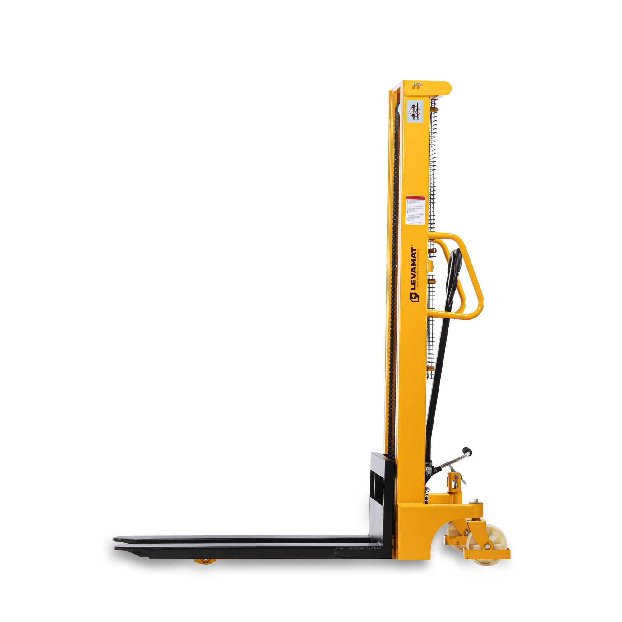 Avec une capacité de levée jusqu’à 3000 mm, ce gerbeur est pensé pour les applications nécessitant un accès aux rayonnages hauts, sans recourir à un appareil motorisé. Il est particulièrement adapté aux entreprises de transport, centres de distribution, ou entrepôts de stockage grande hauteur, où la multiplication des niveaux est nécessaire pour gagner en capacité sans agrandir l’emprise au sol. Les fourches de 1150 mm sont compatibles avec les palettes Europe (EPAL 1) et les caisses grillagées, permettant une prise standardisée dans tous les secteurs d’activité.