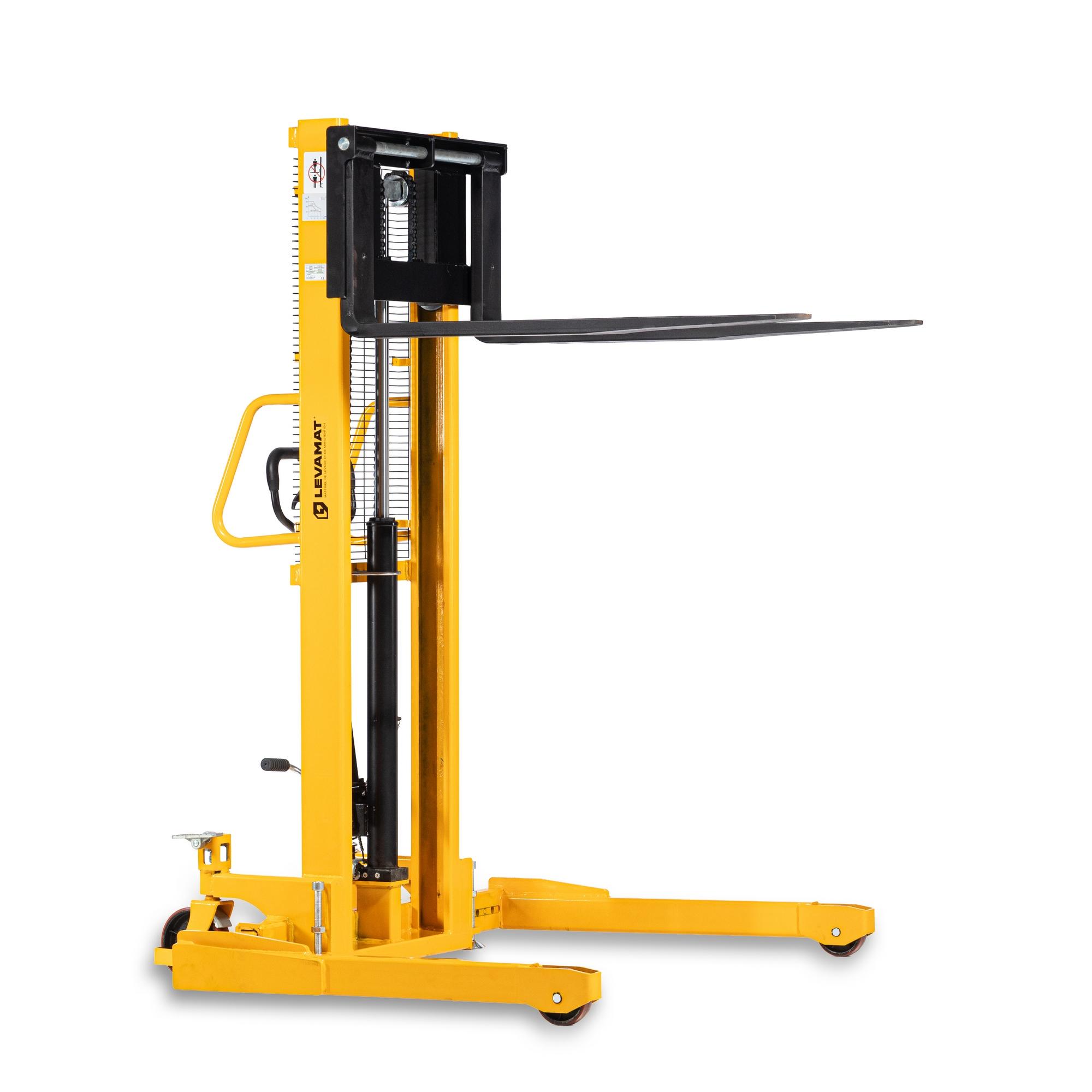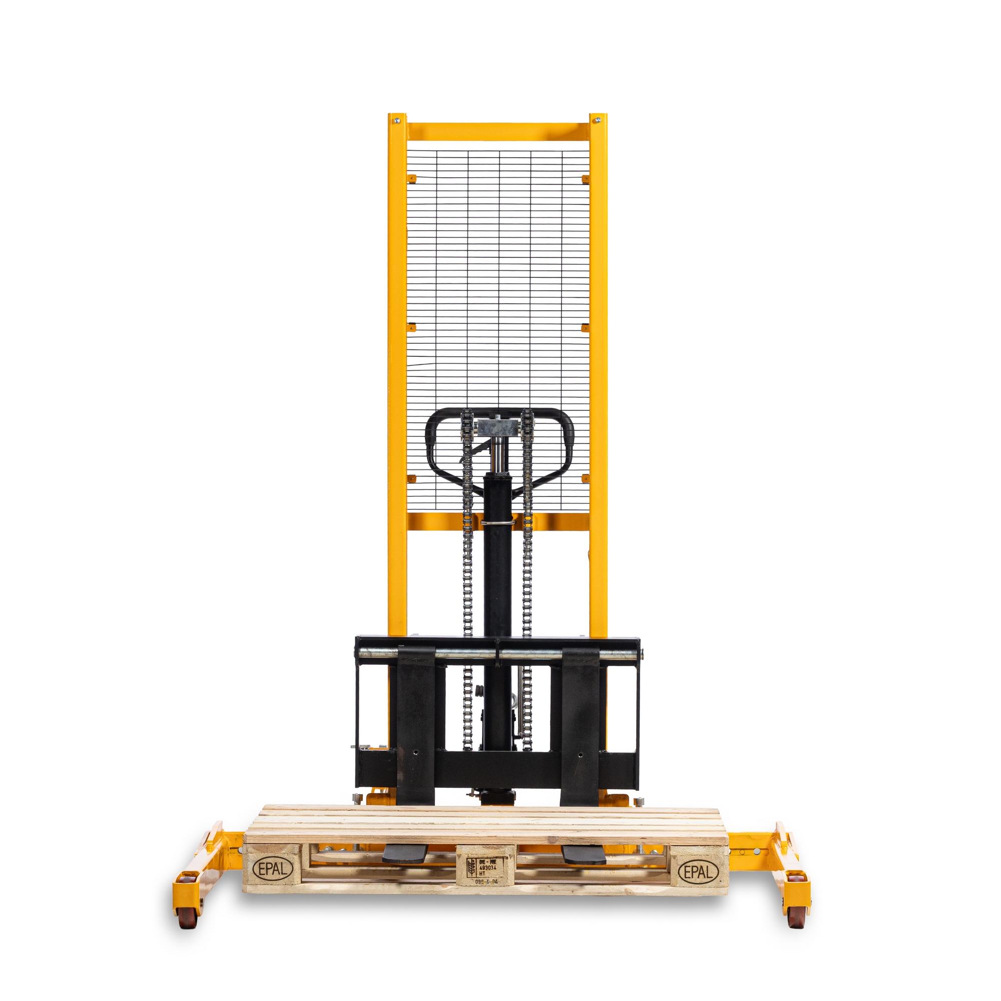Contrairement aux gerbeurs traditionnels, ce modèle dispose de bras écartés au sol, permettant d’encadrer complètement la palette. Cela rend possible la prise latérale des palettes Europe par leur largeur, ainsi que la manutention de palettes pleines, grillagées ou spéciales sans point d’entrée inférieur.