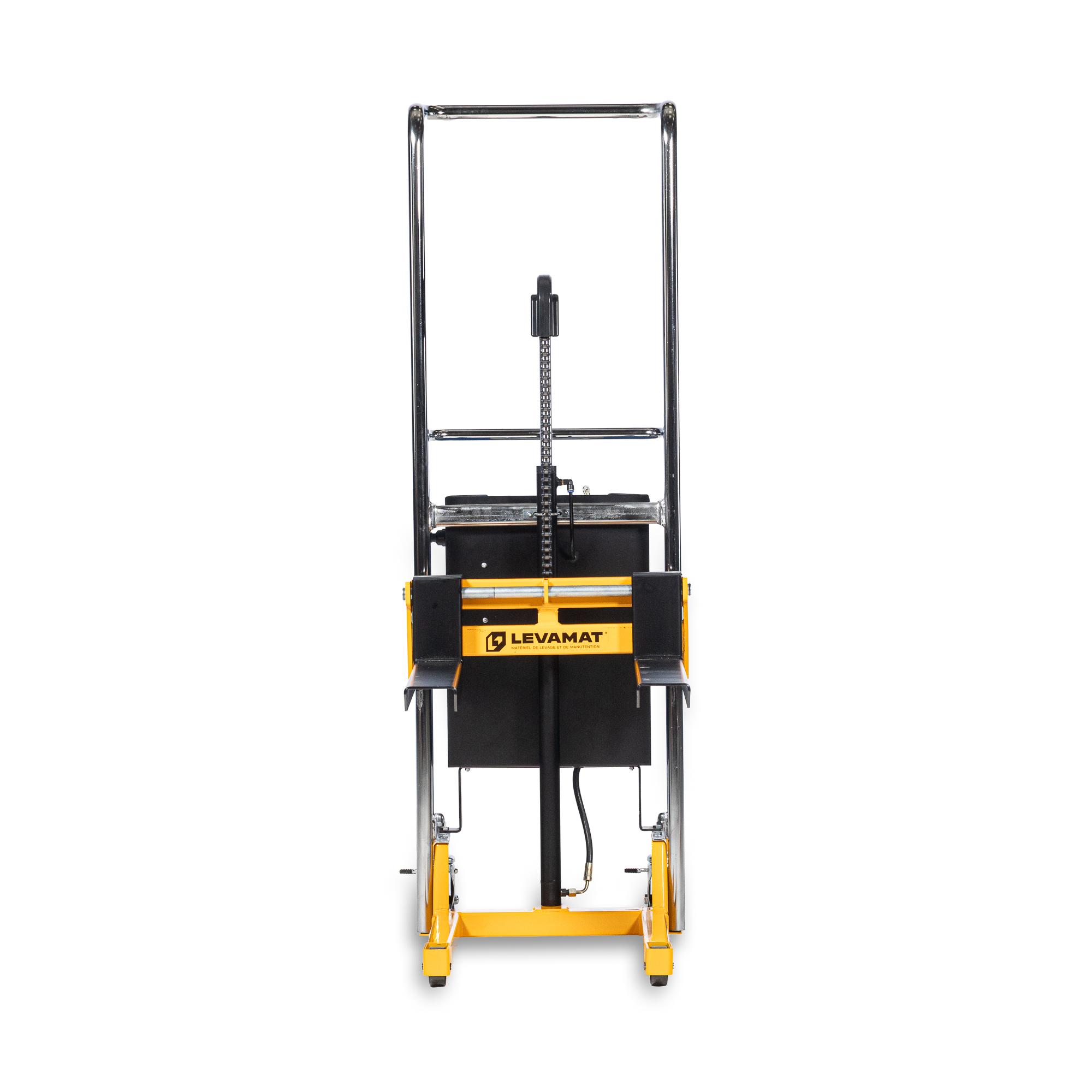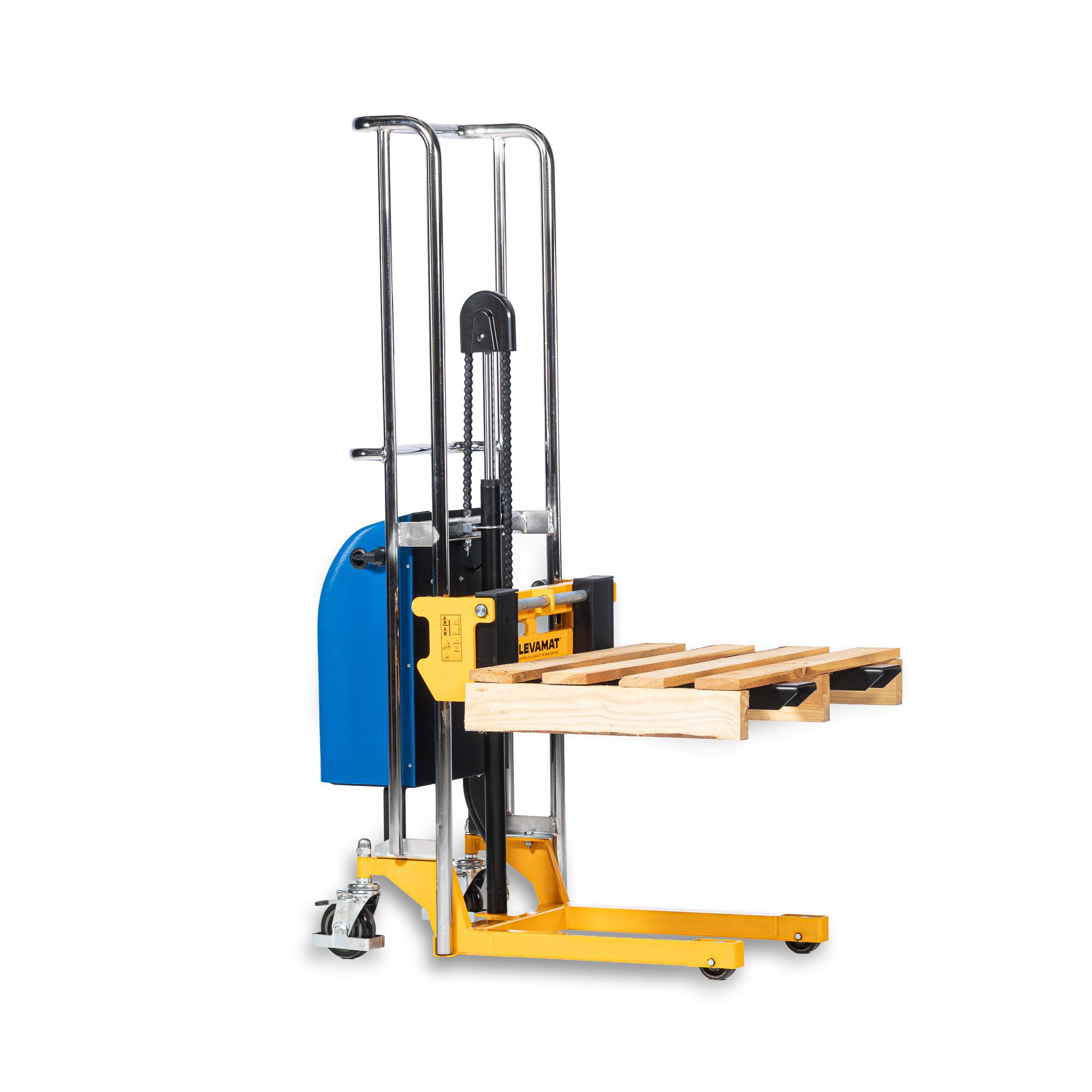 La levée est assurée par un système électrique, piloté via une commande intégrée sur l’appareil. Ce dispositif permet de monter la charge jusqu’à 1500 mm sans effort physique, ce qui réduit considérablement la pénibilité lors des opérations répétitives et les risques de Troubles Musculo Squelettiques. Le déplacement est manuel, favorisé par une poignée ergonomique et une structure compacte qui permet de circuler facilement entre les rayonnages ou dans les zones restreintes.