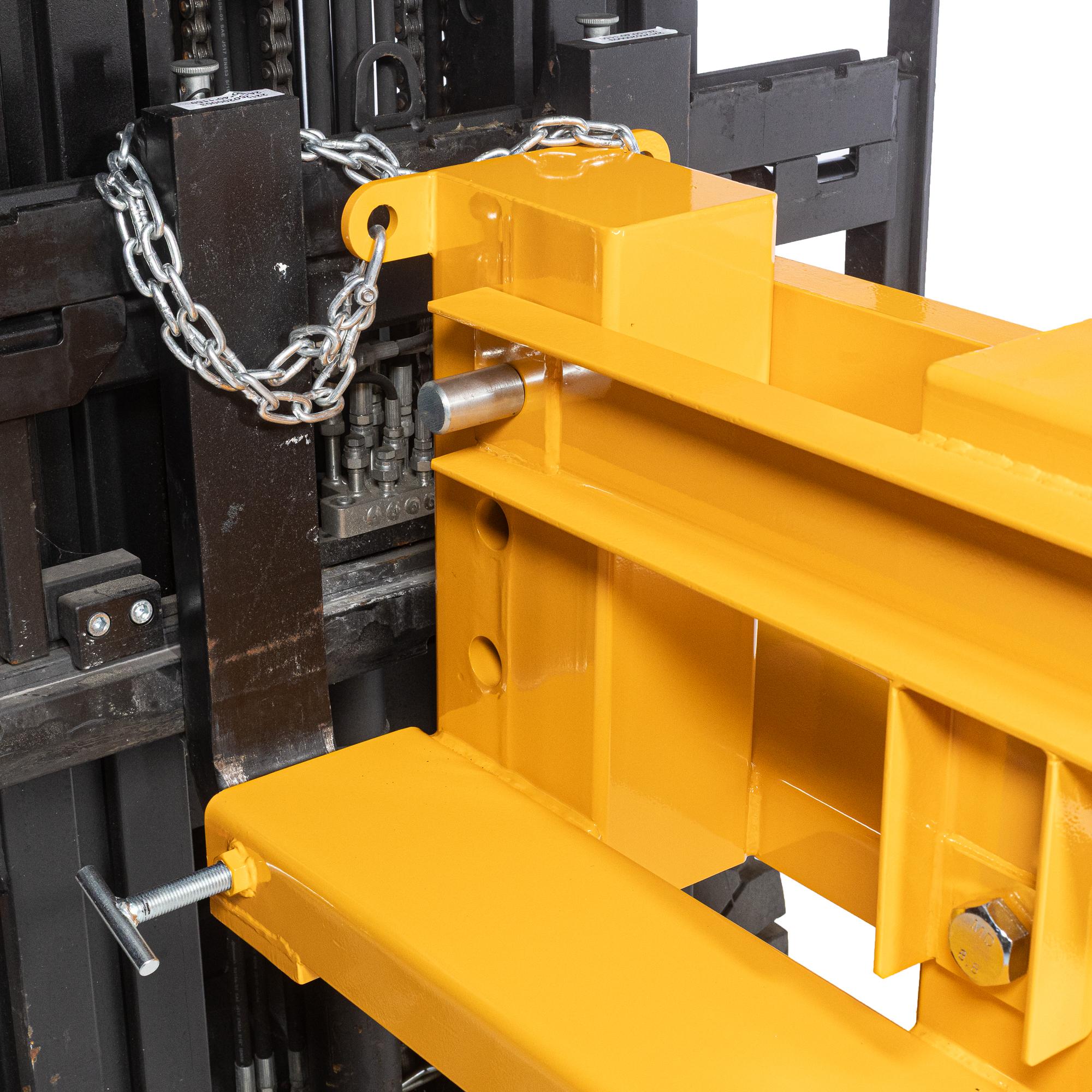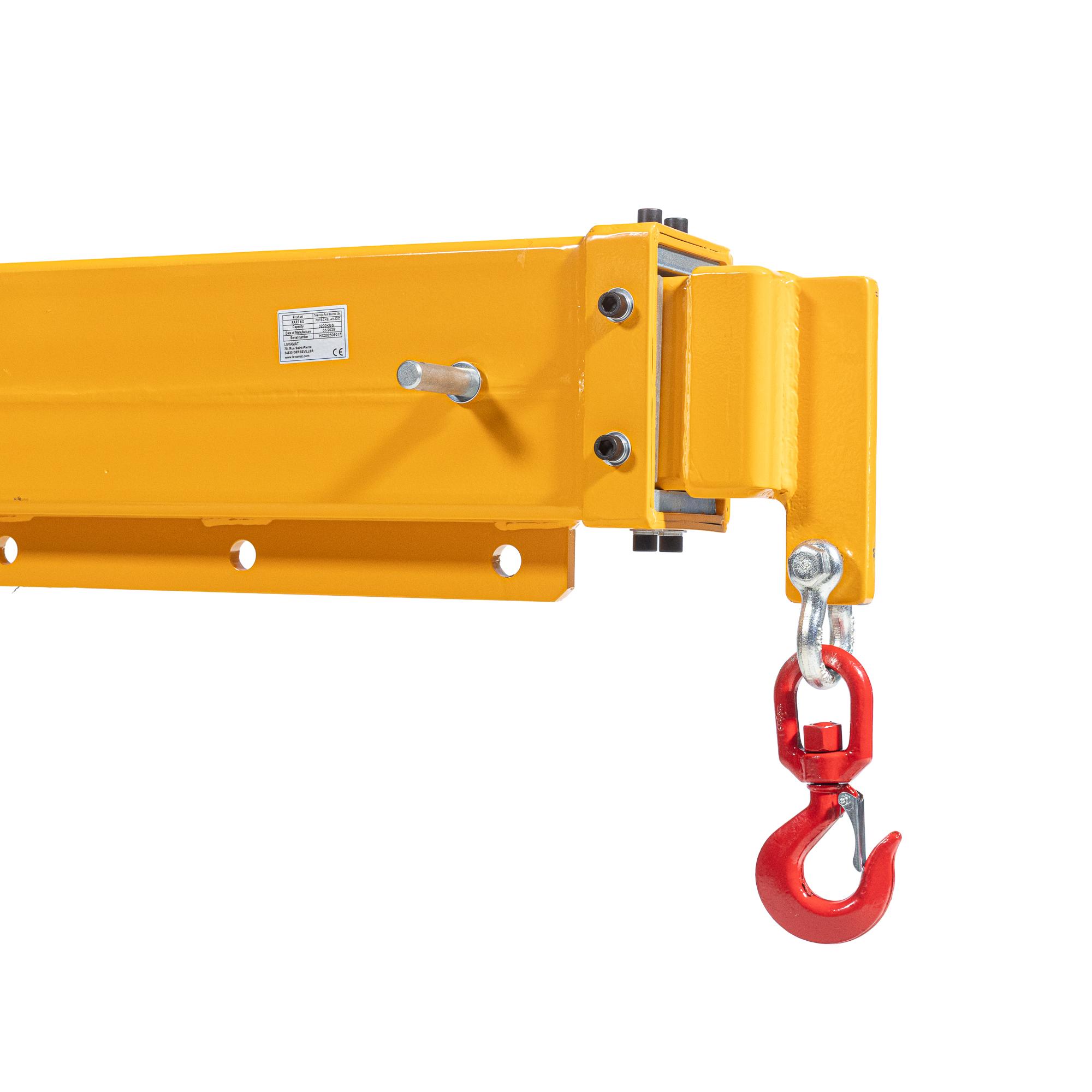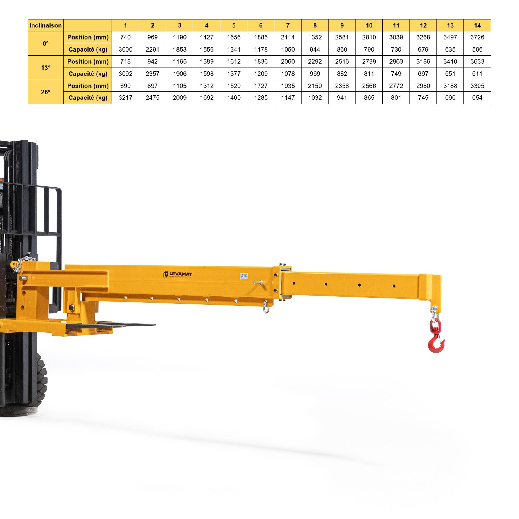 La flèche articulée peut être inclinée manuellement à 0°, 13° ou 26°, pour adapter l’angle d’attaque en fonction de la configuration de travail. Le réglage en longueur de 740 mm à 3726 mm se fait sur 14 positions, permettant un ajustement précis selon le poids et la portée recherchés.