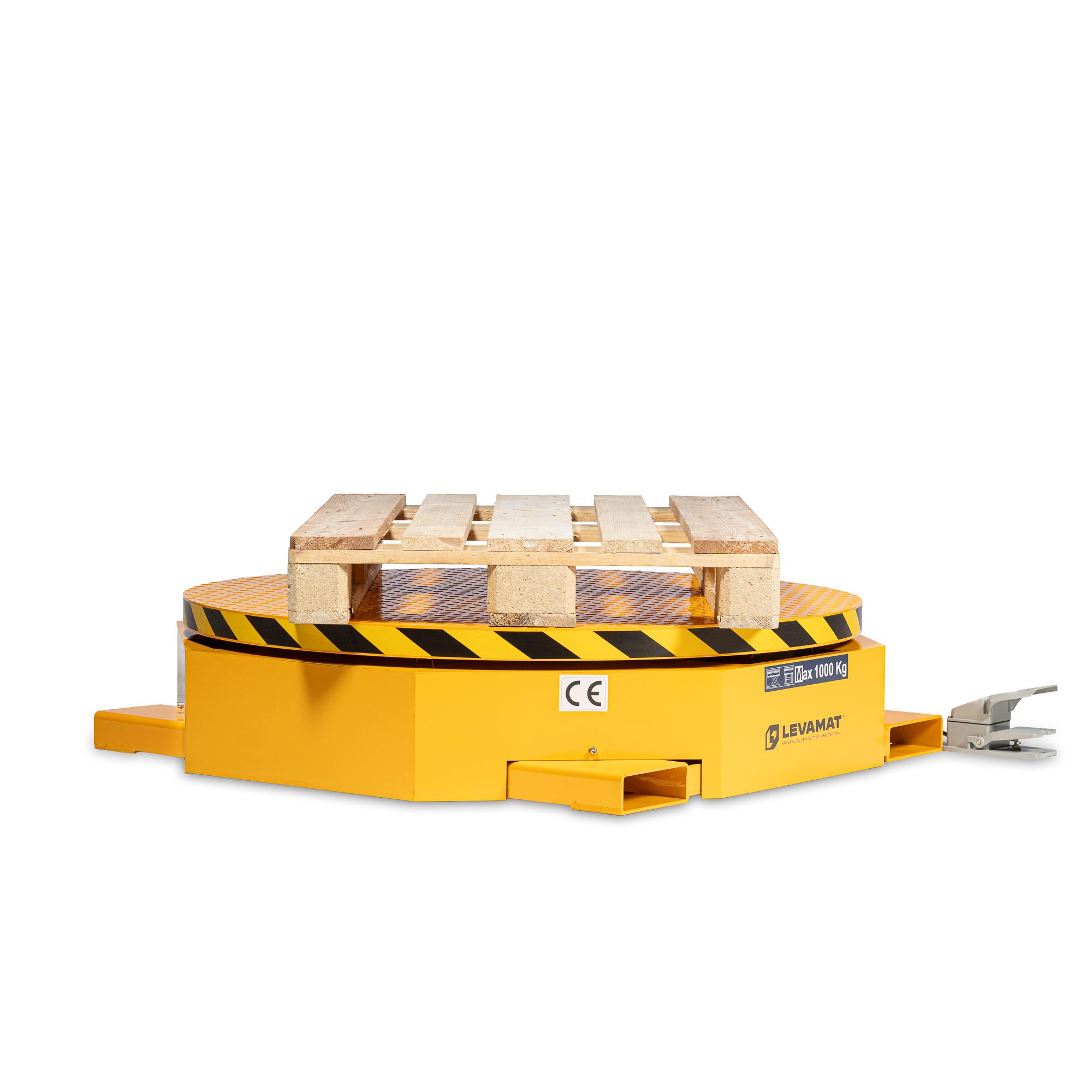Cette table est particulièrement utilisée pour les opérations de banderolage où l’opérateur doit accéder à tous les côtés d’une palette. Le plateau rotatif permet de faire pivoter la charge sans déplacement, réduisant les torsions du dos et les efforts liés à la marche autour de la charge.