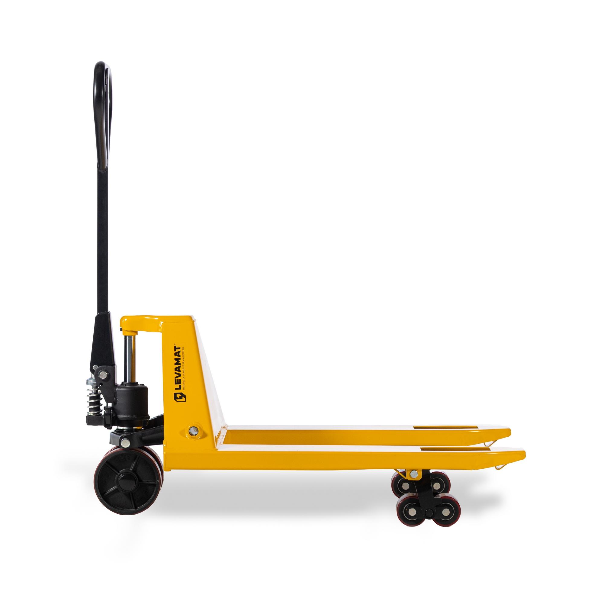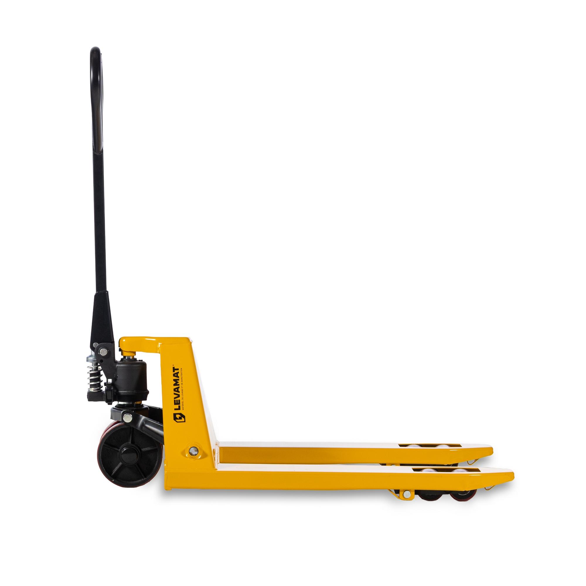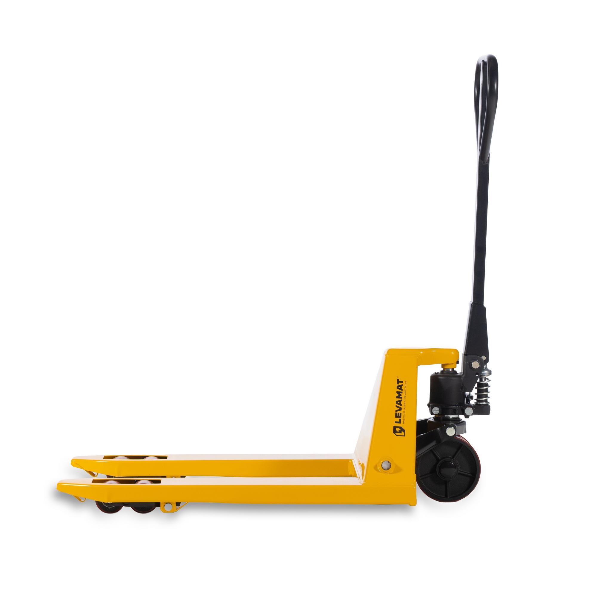 Son ergonomie unique le rend particulièrement efficace dans les petits camions, entrepôts ou zones de préparation densifiées. Le rayon de braquage réduit, combiné à une largeur d’ouverture entre fourches supérieure à la moyenne, permet de manipuler des charges spécifiques là où un transpalette classique serait limité.