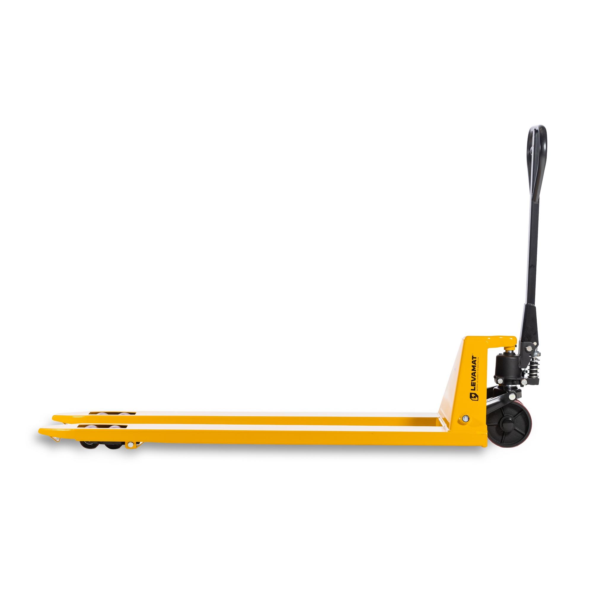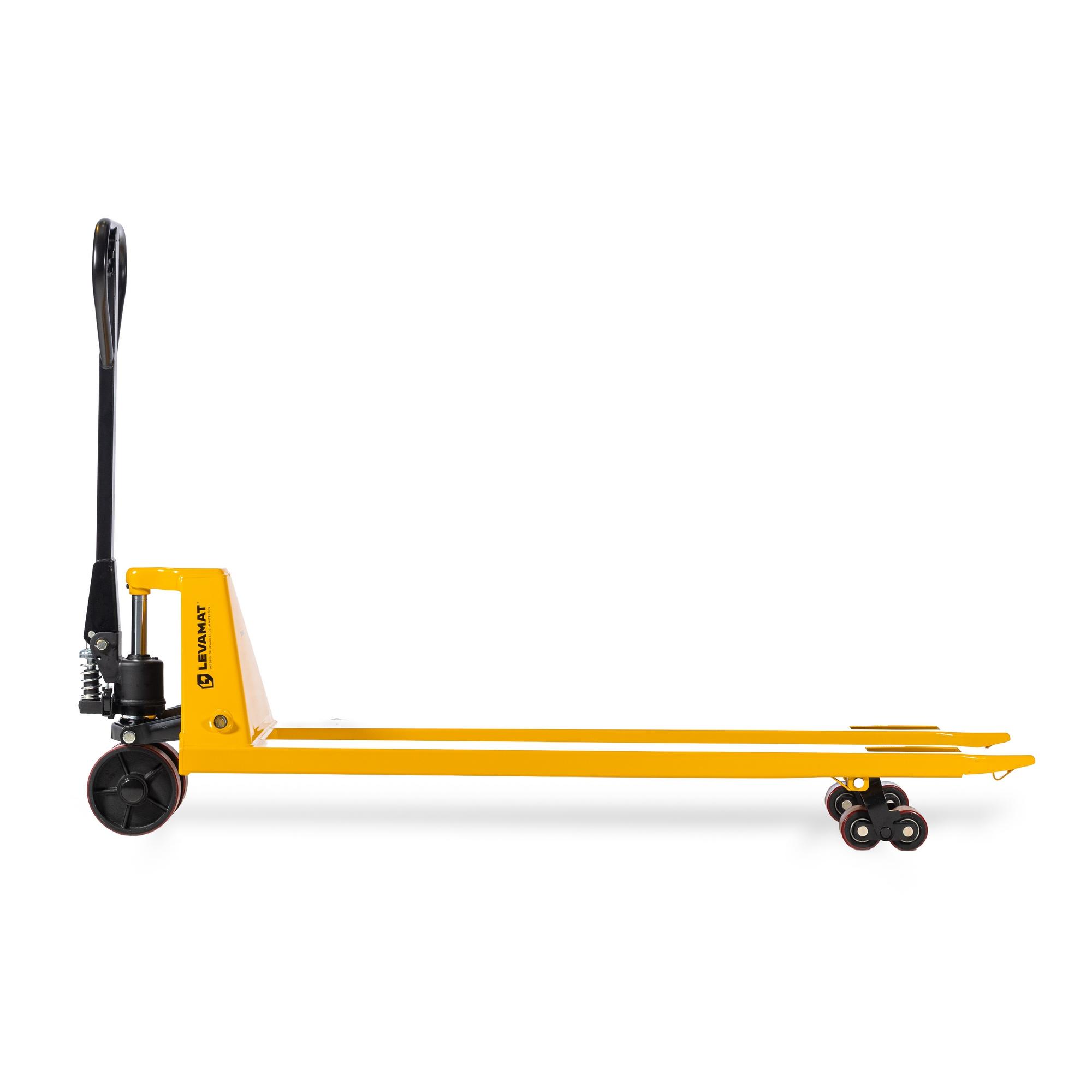 Lorsqu’il s’agit de palettes longues, mobilier, charges étendues ou de doubler les petites palettes sur un même trajet, ce modèle est la solution. La longueur des fourches permet de gagner en efficacité, en limitant les allers-retours, tout en conservant une bonne manœuvrabilité sur sol plat.